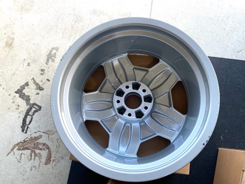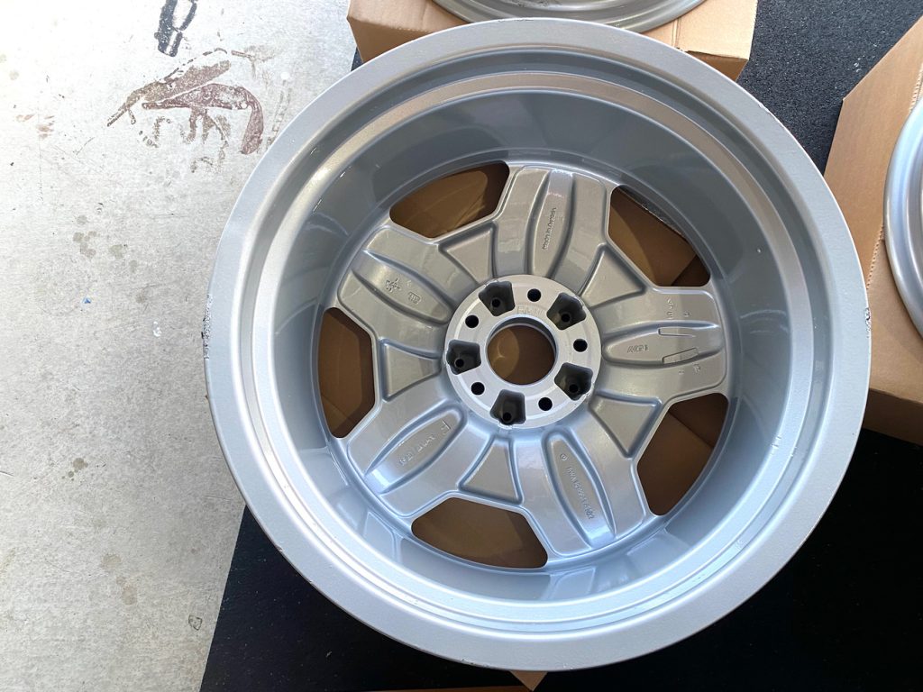 These 18″ AMG Aero II Monoblock wheels measure 8″ wide all around, and were manufactured by Mercedes-Benz for use on W210 and R129 Mercedes-Benz AMG vehicles. The faces are finished in silver and show AMG HWA stamped part numbers on the back. Dimensions, offsets, and other manufacturer casting marks are present on each wheel. Each wheel has been refinished in preparation for the sale and the seller will be including a full set of OEM center caps.